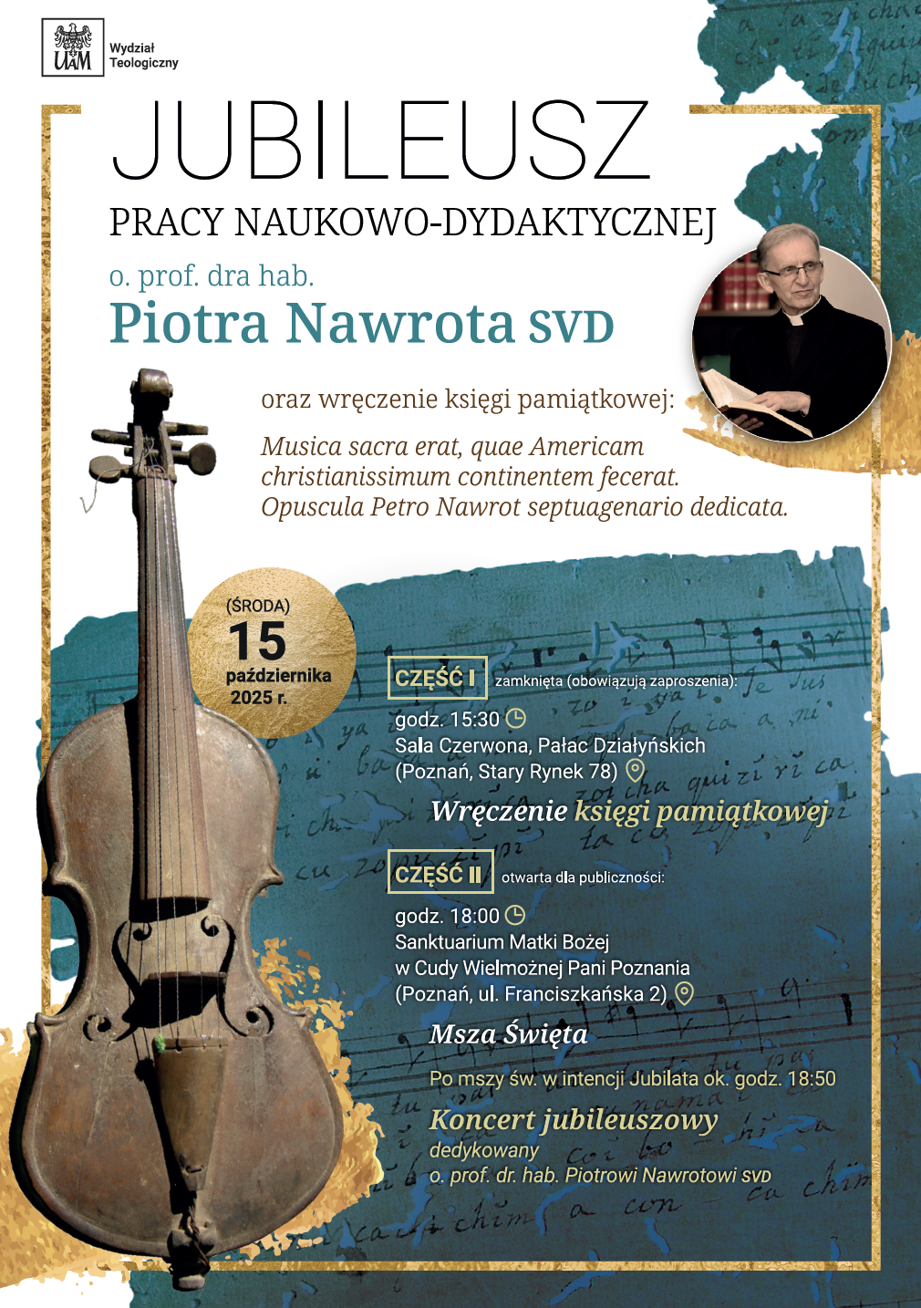 W środę 15 października zapraszamy do naszego Sanktuarium wraz z Wydziałem Teologicznym UAM na dziękczynną Mszę świętą za działalność naukowo-dydaktyczną o. prof. dr hab. Piotra Nawrota SVD o godz. 18.00 oraz po niej na koncert w wykonaniu Chóru Kameralnego UAM pod dyrekcją prof. Krzysztofa Szydzisza.